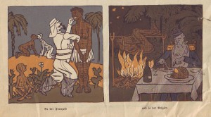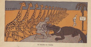 The German satirical magazine Simplicissimus started in 1896 and continued into the 1940s, despite many law suits from offended people. The Munich-based weekly issued a Colonial edition on 3 May 1904, expressing its opinions of imperialism in Africa. The amorous French (note the ‘half-caste’ child) and the greedy Leopold (his African empire became the Belgian Congo in 1908), (below) the numbered giraffes and the smug British suggest that attitudes to African imperialism in Europe were broad.