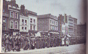 Army parades were often attacked, and Captain William Ley was attacked by three men in Notting Hill, London in July 1882. Joseph Roker, a black Salvationist, told the court he was attacked as he carried the banner. One man was sent to prison for a month; the other two left the court free men (Daily News 17 August 1882).